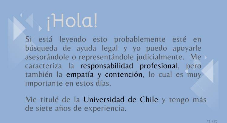 •Abogada U. de CHILE 🇨🇱💕 •Postítulo en Litigio Estratégico (por la U. Alberto Hurtado de Chile) •Magíster en Gobernanza y Derechos Humanos (por la U. Autónoma de Madrid🇪🇸 🔶️Con una perspectiva de género e infancia, mi misión como abogada es proteger y recuperar tu economía familiar dentro y fuera de tribunales, blindar tus intereses y los de tu familia, para que puedan vivir con tranquilidad. Porque sí: el dinero importa y de amor nadie vive ❤️🔥 En esa línea, te acompaño desde el inicio hasta el final. Los servicios consisten en: Etapa 1 de Negociación e Información: 1️⃣ Tabla de Cálculo Alimentos (para Mediación); 2️⃣ Asesorías Integrales en materia de Bienes y Familia (para Mediación Alimentos, redacción de bases de Acuerdo completo y suficiente en divorcio de común acuerdo y otras herramientas) 💎 Objetivo Etapa 1: Prepararte para enfrentar tus instancias de Acuerdos, afectando lo menos posible tu economía familiar. Etapa 2 de Judicialización o Demanda (Sólo si tu mediación o acuerdo se frustra): 1️⃣ Representación judicial directa para entablar demandas de alimentos, divorcio y compensación económica, declaración de bien familiar, etc. 💎 Objetivo Etapa 2: Blindar de forma judicial tu economía familiar con una estrategia clara y acompañamiento. Etapa 3 de Cumplimiento (sea por acuerdo o sentencia judicial) 1️⃣ Cobro de deuda de Alimentos 2️⃣ Asesoría de Causa de cumplimiento (apremios, objeciones a la liquidación, etc) 2️⃣ Ebooks en etapa de Cumplimiento 💎 Objetivo Etapa 3: Exigir el cumplimiento legal de los puntos alcanzados en etapa 1 o 2. 🔶️Como abogada penalista también ofrezco acompañamiento y tramitación como querellante a víctimas del Delito de Maltrato Habitual y otras materias penales. Todo lo anterior desde una enfoque de género, infancia y derechos humanos. Bienvenidos y bienvenidas ❤️🔥