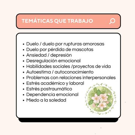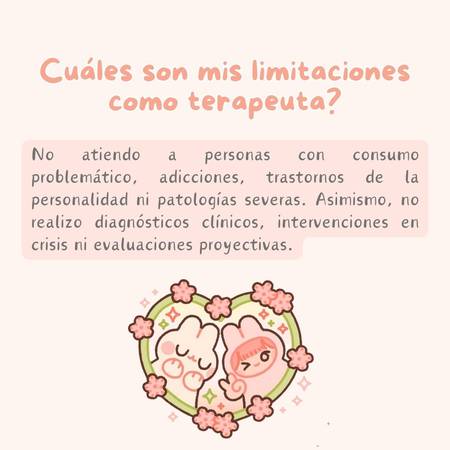 Hola 🎀 soy Alejandra Jaque, psicóloga clínica con experiencia en el acompañamiento terapéutico de mujeres (desde los 17 años) y personas de la comunidad LGBTQIA+. Mi propósito es ofrecer un espacio seguro, empático y libre de juicios, donde puedas expresarte con libertad y contar tu historia desde la contención, la seguridad y la comprensión. Trabajo desde un enfoque integral y centrado en objetivos, lo que me permite adaptar las herramientas terapéuticas a las necesidades únicas de cada persona. Mi práctica se apoya en la Terapia Cognitivo-Conductual (TCC), integrando también otras perspectivas clínicas que facilitan un proceso profundo y personalizado. En cuanto a mi formación, cuento con un diplomado en intervenciones terapéuticas en infancia y adolescencia, además de formación en intervención clínica para personas adultas. Me he especializado en el tratamiento de depresión, ansiedad, regulación emocional, aceptación corporal y autoestima. 📑 ¿Cuáles son mis limitaciones como terapeuta? No atiendo a personas con consumo problemático, adicciones, trastornos de la personalidad ni patologías severas. Asimismo, no realizo diagnósticos clínicos, intervenciones en crisis ni evaluaciones proyectivas. 📍Todos mis servicios tienen la opción de boleta de honorarios reembolsables en isapres y seguros médicos.