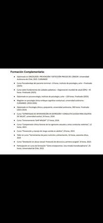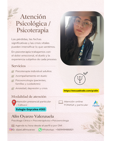 ¡Hola! Mi nombre es Alin Oyarzo Valenzuela. Soy psicóloga clínica titulada de la Universidad de Los Lagos, con formación complementaria en salud mental, psicooncología y cuidados paliativos. Actualmente curso el Magíster en Psicología Clínica con Enfoque Cognitivo Conductual en la Universidad Autónoma de Chile, lo que me permite integrar herramientas actualizadas y basadas en evidencia en cada proceso terapéutico. Trabajo con personas adultas que atraviesan desafíos emocionales como ansiedad, estrés, bajo ánimo, crisis personales, experiencias traumáticas, consumo problemático, dificultades relacionales, duelos y procesos vitales complejos. A lo largo de mi experiencia en distintos dispositivos de salud he acompañado a pacientes en situaciones de alta vulnerabilidad emocional, integrando una mirada respetuosa, humana y profundamente consciente del contexto de cada persona. Además, cuento con una sólida formación en psicooncología y cuidados paliativos, con diplomados y cursos en duelo, acompañamiento al final de la vida, cuidados paliativos universales y psicoabordaje del paciente crítico. Esta área se ha convertido en una vocación significativa para mí: acompañar a personas y familias que viven procesos de enfermedad, cambios de salud, tratamientos médicos o pérdidas profundas desde un espacio seguro y cálido. Mi enfoque es siempre humano, colaborativo y centrado en tus necesidades. Busco que cada sesión sea un espacio donde puedas explorar con calma lo que te duele, fortalecer tus recursos internos y avanzar hacia una vida con mayor bienestar emocional y claridad. Actualmente realizo atención (presencial desde enero 2026) y online en la actualidad, lo que permite mayor flexibilidad, privacidad y accesibilidad para quienes necesitan apoyo psicológico desde cualquier lugar. Si las cosas se han vuelto complicadas o difíciles, buscas orientación o si simplemente necesitas un espacio para ti, estaré encantada de acompañarte en este proceso. Puedes escribirme o agendar directamente tu sesión. Estoy aquí para ayudarte. 💛 📩 Correo: alin.oyarzo.valenzuela@gmail.com WhatsApp: +56949486821