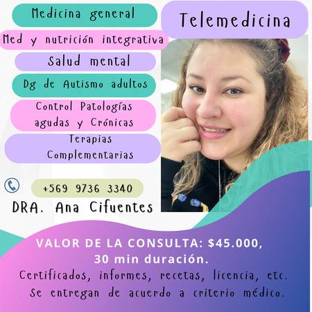 • Medicina General adultos y niños •Te acompaño a transitar duelos • Enfoque HAES (Salud en todas las tallas), no pesocéntrico. • Salud mental, depresión, ansiedad, trastornos de conducta alimentaria, duelos por suicidio. • Espacio seguro para neurodivergencias. • Diagnósticos de Autismo en adolescentes y adultos (Clínico). • Medicina general para adultos, adolescentes y niños, patologías agudas y crónicas. • Terapias complementarias 💖 • Tratamiento de SIBO • Nutrición basada en plantas 🌱 Médica general enfocada en medicina integrativa, salud mental y nutrición, ofrezco un abordaje completo y compasivo a la salud de mis pacientes. Como terapeuta complementaria, mi objetivo es acompañarte con cariño y profesionalismo en cada etapa de tu proceso. Brindo atención por telemedicina y servicios de terapia complementaria, optimizando tu acceso al cuidado que mereces. Las atenciones de medicina general pueden ser de patologías agudas, crónicas, niños sobre 7 años hasta adultos.