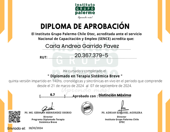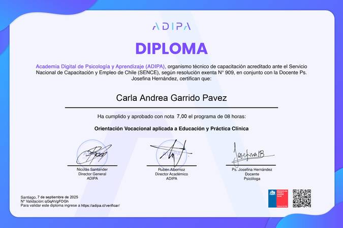 Hola! Soy Carla Garrido, psicóloga egresada de la Universidad Mayor de Temuco, cuento con formación en Terapia sistémica breve y gran interés en la incorporación de técnicas de arteterapia, por lo que busco constantemente instancias que me permitan seguir aprendiendo sobre ello. Acompaño a personas mayores de 17 años en procesos de psicoterapia y orientación vocacional. Dentro de las temáticas que podemos trabajar se encuentra el estrés, duelo, ansiedad, angustia, autoconcepto y autoestima, reconocimiento y expresión emocional, relaciones interpersonales, etc. Realizo atenciones de manera online y presencial en la ciudad de Temuco. Mi objetivo es poder construir en conjunto un espacio seguro, basado en el respeto, la validación y la empatía, adaptando el proceso a tus propias necesidades y experiencias. Si estás buscando un espacio para trabajar en tu bienestar, será un gusto acompañarte en tu camino.