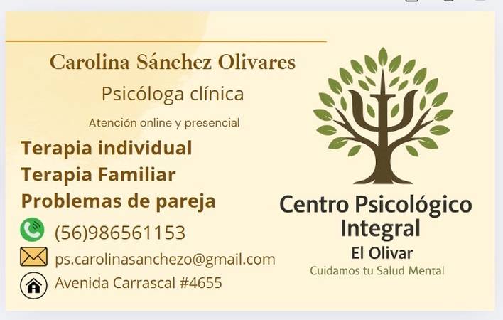 Mi nombre es Carolina Sánchez Olivares soy psicóloga clínica y educacional, trabajo con niños, adolescentes, adultos y personas mayores. Acompaño procesos emocionales relacionados con trauma, ansiedad, depresión, trastornos de la personalidad, trastorno de déficit atencional, trastorno obsesivo compulsivo. Mi enfoque es integrativo con base en la Terapia Cognitivo Conductual (TCC) y Mindfulnes. ✨Diplomada en Convivencia Escolar ✨Diplomada en psicoterapia infanto juvenil ✨Diplomada en Trauma ✨Formación en EPR para el TOC
