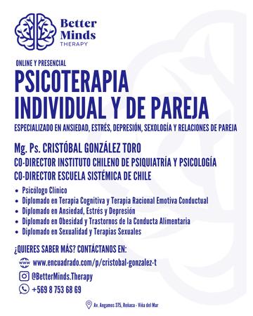 Psicólogo con más de 15 años de experiencia profesional. Co-Director del Instituto Chileno de Psiquiatría y Psicología (ICHIPSI), desde donde nos dedicamos a contribuir al desarrollo de la salud mental, ofreciendo: atención clínica online, cursos de postgrados y capacitaciones para profesionales en el área de la psicología y psiquiatría. Cuento con formación académica especializada de postgrado que respalda mi enfoque práctico y orientado a resultados: • Diplomado de Primer Nivel en Terapia Cognitiva y Terapia Racional Emotiva Conductual (UCES, Argentina). • Diplomado en Ansiedad, Estrés y Depresión (UCES, Argentina). • Diplomado en Obesidad y Trastornos de la Conducta Alimentaria (UCES, Argentina) • Diplomado en Sexualidad y Terapias Sexuales (UCES, Argentina). • Máster en Administración de Negocios (MBA), Pontificia Universidad Católica de Valparaíso. • Magister en Desarrollo Organizacional y Gestión Estratégica de Personas, Universidad Diego Portales. Enfoque Terapéutico: Mi trabajo clínico se basa en un enfoque cognitivo-conductual y racional emotivo-conductual, dos modelos ampliamente validados por la evidencia científica y centrados en generar cambios concretos y sostenibles en la vida de las personas. Me especializo en el tratamiento de: • Ansiedad • Estrés • Depresión • Obesidad y Trastornos de la Conducta Alimentaria • Sexología / Terapias Sexuales • Terapia de Pareja En cada proceso terapéutico priorizo la psicoeducación, el desarrollo de habilidades prácticas y la generación de hábitos sostenibles que promuevan el bienestar emocional. Agenda tu sesión: Si estás buscando un espacio de acompañamiento profesional, te invito a agendar una sesión online o presencial, a través de Better Minds Therapy. Será un gusto acompañarte en este camino de crecimiento y bienestar. Redes Sociales: Instagram: @BetterMinds.Therapy | @ichipsi.cl Whatsapp: +569 87536869