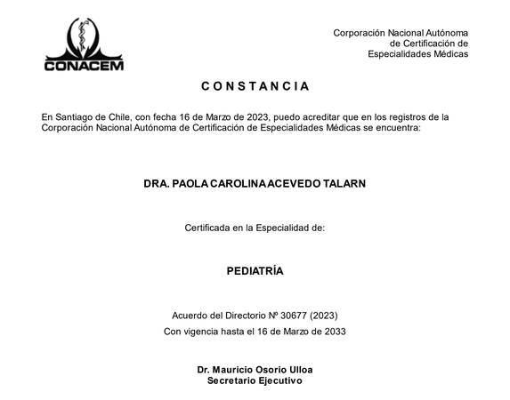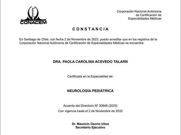 Neurólogo Infantil / Pediatra. Conacem Atención desde recién nacido hasta los 18 años de edad. Diagnostico y seguimiento neurológico en Trastornos del Neurodesarrollo, Trastorno del Espectro Autista, TDAH, Retraso en el desarrollo, Trastorno del lenguaje, Dificultades en el aprendizaje, cefalea / migraña, epilepsia / convulsión febril. Trastorno del sueño y de la conducta. Valoración estudiantes que integran Programa PIE Seguimiento de recién nacido prematuro y de alto riesgo biológico. Excluyendo patologías Psiquiátricas Atención Presencial: Talca * Centro Pediátrico Integral SANUS * Edificio Pichimapu: Piso 5 Atención previa reserva a través de Telemedicina