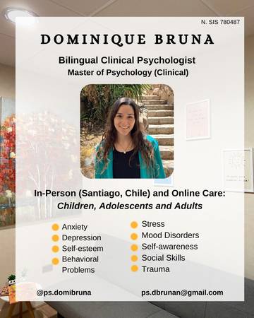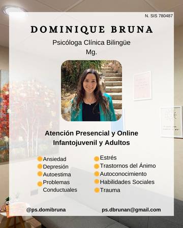 Soy Dominique, Psicóloga Clínica bilingüe con Magister Clínico, especializada en brindar apoyo a niños, adolescentes y adultos jóvenes. Ofrezco sesiones personalizadas tanto online como presenciales en Santiago, Chile, diseñadas para ser un espacio seguro y dedicado a tu salud mental integral. Mis servicios incluyen colaboración con colegios para el bienestar infantil, con una primera reunión escolar gratuita, como también una relación estrecha con familias para generar cambios desde la cercanía. ¡No dudes en contactarme para más información!: ps.dbrunan@gmail.com.