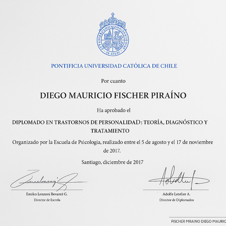 Solicitud de horas por WhatsApp: +56 9 8549 9462. Si buscas un espacio de escucha empática y sin juicios, orientación profesional, y tratamiento farmacológico (emisión electrónica de recetas y licencia en casos pertinentes), estaré encantado de ayudarte. Soy Psiquiatra de adultos, con consulta online y presencial en Las Condes. También soy docente de psiquiatría UANDES, especialista en Trastornos de Personalidad PUC y en Gestión en Salud. Creo en un enfoque integral, trabajando en equipo con psicólogos para brindarte la mejor atención. Realizo supervisión clínica en el Instituto Chileno de Terapia Familiar. Al tomar hora con el Dr. Fischer el paciente consiente a encontrarse en un lugar privado y tranquilo donde se pueda realizar la teleconsulta, respetando los principios de confidencialidad (no se permite grabar las sesiones). Se realizan atenciones en inglés. Pago previo a la consulta.