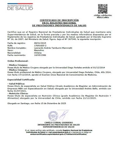 Médico Nutriólogo – Universidad de Chile, INTA Magíster en Nutrición Clínica – Universidad de Chile, INTA Más de 10 años de experiencia clínica. Mi consulta es un espacio seguro, libre de juicios, con empatía. Entiendo que el sobrepeso y la obesidad no son un problema de voluntad, sino condiciones de salud complejas. Trabajamos juntos con objetivos claros, realistas y alcanzables, construidos en conjunto, con acompañamiento continuo en el tiempo y decisiones basadas en evidencia.