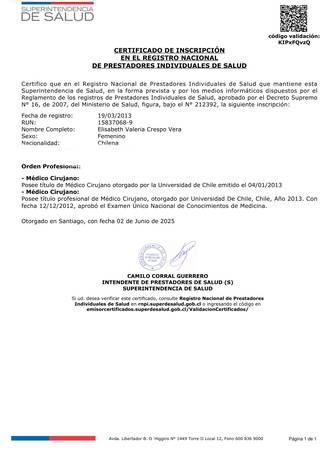 **TEMPORALMENTE SIN AGENDA HASTA EL 09.02.26 POR VACACIONES** Médico Cirujano titulada en la Universidad de Chile, con formación en Gestión en Centros de Salud Familiar (U. de Chile), Medicina Familiar (PUC) y Gestión Pública para Directivos de Salud (UDD). Posee más de 13 años de experiencia en urgencia, atención primaria, acreditación, gestión del Régimen GES y cargos directivos en CESFAM. Brinda atención integral en Medicina General para personas de todas las edades, incluyendo control crónico, salud cardiovascular, salud mental, control del peso y motivos frecuentes de consulta. En esta página usted puede agendar consultas por Telemedicina y Domicilio. Emite licencias médicas, certificados y recetas, incluidas recetas cheque, solo desde plataformas autorizadas y siempre tras evaluación clínica. Su enfoque es integral, por lo que la duración de cada atención puede variar según sus necesidades. Dudas o consultas: draelisabethcrespo@gmail.com Última actualización: 01.12.2025