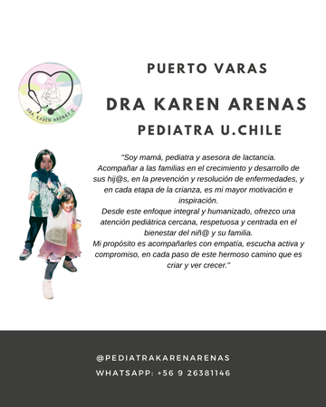 Pediatra de la Universidad de Chile Asesora de Lactancia Certificada en alimentación complementaria y BLW Enfoque integral, respetuoso y personalizado Madre de un niño de 7 años y una niña de 3 años 1. Consulta presencial en Casa del Lago Parcelacion Beyer #6, Puerto Varas 2. Atención online de pediatría para niñ@ san@ y asesoría de lactancia, destete, banco de leche. 3.Consulta prenatal: Si estas embarazada, durante el último trimestre puedes agendar una hora presencial donde abordamos dudas acerca de lactancia, parto y primeros dias, nos preparamos para recibir a tu guagüita 4.Taller de lactancia prenatal; consulta a mi correo electrónico o WhatsApp +56926381146 Contacto: pediatrakarenarenas@gmail.com Instagram: @pediatrakarenarenas WhatsApp+ 56 9 26381146 Casa del Lago +56 9 23908829