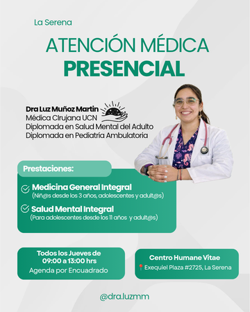 Hola, soy Luz Muñoz Martin Mujer y Médica General Chilena SIS 810452 | RCM 57050-8 Pronombres: ella Me dedico a la medicina general y salud mental integral. Estoy aquí para acompañarte en tus procesos de salud física y emocional desde una mirada humana, respetuosa y segura 🌈✨🌱 Realizo atenciones presenciales en Humane Vitae (La Serena) y por telemedicina, en un espacio seguro, confidencial y cercano. Tanto en medicina general como salud mental integral. Me mantengo en formación continua para entregar una atención actualizada, integral y con la mejor calidad posible 👩🏽🎓⚕️ 🌱Médica Cirujana Universidad Católica del Norte 🌱 Diplomado en Situaciones Críticas de Salud Mental – Universidad de los Andes 🌱 Diplomado en Pediatría Ambulatoria 🌱 Diplomado en Medicina China – Escuela San Bao (c) 🌱 Facilitadora de Biodanza (cursando 2° año) 📌Medicina General presencial para mayores de 3 años y Salud mental presencial para mayores de 11 años. 📌 Telemedicina disponible actualmente solo para personas mayores de 18 años. 📲 Más información en Instagram: @dra.luzmm Gracias por confiar. Te espero