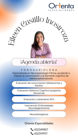 Fonoaudióloga egresada de la Universidad de Concepción, con 13 años de experiencia en la intervención de adultos y personas mayores con trastornos de lenguaje, habla, voz, deglución, cognición y neurodivergencias. Con un enfoque desde la Salud Mental, quiero ayudarte a alcanzar un diagnóstico completo para planificar en conjunto un plan de tratamiento que aborde tus necesidades de funcionalidad y participación. Certificación INTERNACIONAL PEERS® for Young Adults Certified Training Formación - Diplomado en Rehabilitación Neuropsicológica del Adulto. Universidad Diego Portales. - Diplomado en Neuropsicología: Perspectivas teórico prácticas para la comprensión de alteraciones cognitivas a lo largo del ciclo vital. Pontificia Universidad Católica de Chile. - Diplomado de Especialización en Neuropsicología Clínica en Adultos: Evaluación, semiología y psicometría. - Diplomado en Neurorehabilitación Fonoaudiológica en Adulto. Universidad San Sebastián. - Curso de Actualización Demencias y su Abordaje Multidisciplinario. - Curso Evaluación instrumental para usuarios con trastornos de la deglución. - Curso de Actualización Rehabilitación Interdisciplinaria en Personas con ACV Agudo y Subagudo. - Primera Jornada Nacional Deterioro Cognitivo 2022. - "Manejo Fonoaudiológico de la persona con COVID19 y sus secuelas". - CURSO HERRAMIENTAS PARA LA GESTIÓN DE CASOS DE PERSONAS CON DEMENCIA. - Curso: Nuevos enfoques en rehabilitación neuropsicológica: perspectiva actuales en la rehabilitación de adultos con lesiones cerebrales adquiridas. Certificación en Escala Wechsler de Inteligencia para Adultos, Cuarta Edición (WAIS IV). ADIPA. - Webinar Juego y Autismo, FUNDACIÓN CHILENA DEL AUTISMO, 2020 - Aba y Autismo, Inicial, Avanzado y Profundización, FUNDACIÓN CHILENA DEL AUTISMO, 2020 - TEACCH, Respuesta Educativa en TEA, FUNDACIÓN CHILENA DEL AUTISMO, 2020 - ESDM, Introductorio, FUNDACIÓN CHILENA DEL AUTISMO, 2019 - Curso cognición social, INSTITUTO DE NEUROCIENCIA Y BIENESTAR, 2022.
