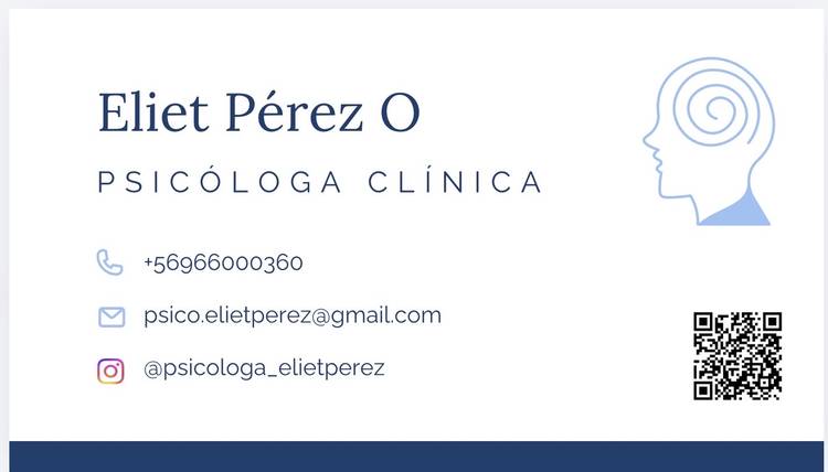 🌱 Sobre mí ¡Hola! Soy Eliet Pérez, Psicóloga Clínica. Acompaño adolescentes, adultos y parejas. Mi enfoque integra las miradas psicodinámica, sistémica y relacional, lo que me permite comprender no solo tu mundo interno, sino también cómo tu historia familiar y social influyen en quién eres hoy. Mi propósito es ofrecerte un espacio seguro, de respeto y contención, donde podamos trabajar juntos en la reparación y transformación emocional. Busco que logres construir vínculos más saludables y una vida que sea verdaderamente coherente contigo mism@. ¿Cómo trabajaremos? La atención psicológica se desarrolla en un espacio de confidencialidad y respeto. En la primera sesión se evalúan las necesidades del consultante, instancia donde manifiesta lo que hizo que llegara a consultar, para luego en las próximas sesiones definir el proceso terapéutico más adecuado. Cada proceso es úrico, iremos a tu ritmo. Mi metodología combina la exploración profunda de tu historia emocional con herramientas concretas para el día a día: Regulación emocional para el manejo de crisis. Psicoeducación para entender tus procesos. Análisis de dinámicas vinculares para mejorar tus relaciones. Cuento con amplia trayectoria trabajando con niños, adolescentes y adultos en temáticas de alta complejidad como: Trauma y crisis: Abuso sexual, maltrato, negligencia y estrés post-traumático. Duelos: Acompañamiento en pérdidas humanas y también duelo animal. Salud Mental: Ansiedad, crisis de pánico, depresión, otros. Relaciones: Conflictos de pareja, crisis vitales, desafíos en la parentalidad y dinámicas familiares judicializadas. ¿Te gustaría que comencemos a explorar juntos ese espacio de bienestar que hoy necesitas? Te espero 🌱✨🧠😊 🌿 La terapia es un espacio de encuentro donde las experiencias emocionales pueden ser comprendidas y transformadas en nuevas posibilidades de bienestar. A veces el primer paso es el más difícil, pero no tienes que darlo sol@, no es rendirse es un acto de valentía. _____________________________________________________________ 🩺N° Prestador Superintendencia de Salud: 910774 📧Contacto: psico.elietperez@gmail.com