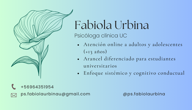 Soy psicóloga clínica titulada de la Pontificia Universidad Católica de Chile y me especializo en el acompañamiento de adultos y adolescentes (desde los 13 años) en procesos psicoterapéuticos desde una mirada integrativa, flexible y centrada en las necesidades de cada persona. Mi trabajo se inspira principalmente en el enfoque sistémico, incorporando a su vez herramientas de la terapia cognitivo-conductual, siempre con el objetivo de ofrecer un tratamiento personalizado. Actualmente realizo atenciones en modalidad online y presencial (Providencia), proporcionando un espacio terapéutico seguro y empático. Gracias por estar aquí! si estás pensando en comenzar un proceso psicoterapéutico, me encantaría acompañarte. Puedes agendar conmigo aquí abajo :) instagram: @ps.fabiolaurbina