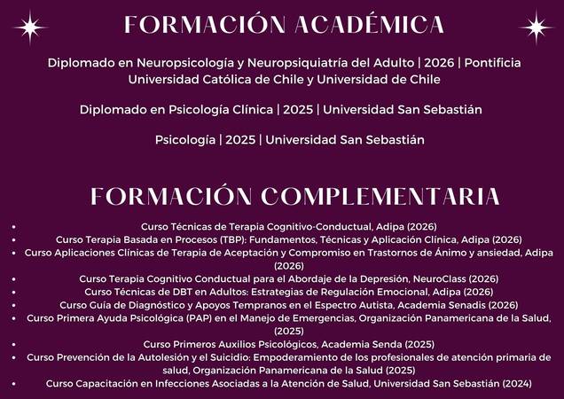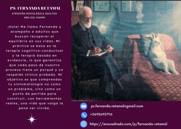 Hola, soy Fernanda. Para mí, la terapia es como un traje hecho a medida: un proceso único que diseñamos juntos, adaptando las herramientas clínicas a tu historia, tus tiempos y tus objetivos personales. ¿Desde dónde trabajo? Mi compromiso es entregarte una atención de excelencia y con respaldo científico. Me especializo en terapia cognitivo-conductual y terapias de tercera generación (como ACT, DBT, TBP). Esto significa que nuestra labor siempre estará guiada por terapias basadas en la evidencia y que cuenten con el mayor respaldo científico de que funciona, asegurándote un espacio profesional, actualizado y, sobre todo, efectivo. Especialización constante: Para ofrecerte lo mejor, me mantengo en formación permanente. Actualmente, me encuentro cursando un postítulo en la Universidad de Chile y la Pontificia Universidad Católica de Chile, especializándome en neuropsicología y neuropsiuiatría del adulto. ¿Qué buscaremos en nuestras sesiones? No solo busco escucharte, busco que comprendas cómo funciona tu mente y que te lleves herramientas prácticas para enfrentar el malestar, regular tus emociones y tomar decisiones que te hagan sentido. Mi estilo es cercano, transparente y muy colaborativo. Si buscas un espacio profesional, con base científica pero profundamente humano, te espero en sesión para que empecemos a trabajar en tu traje a medida.