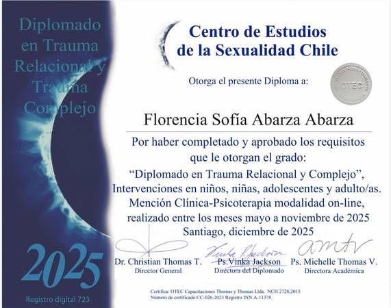 Hola! Soy Florencia, psicóloga clínica Integrativa y especialista en Trauma. Trabajo con niñeces, adolescentes y adultos. Mi perspectiva de trauma integra el psicoanálisis relacional, teoría de apego y sexualidad. Trabajo con el CONOCIMIENTO VÁLIDO de las distintas corrientes de la psicología, por lo que los cambios y resultados que se logran en la terapia se sostienen en el tiempo, incluso luego de que seas dado/a de alta. Me formé con una visión humanista y transpersonal de la psicología, por lo que veo a las personas a partir de su potencialidad, ayudándoles a descubrir nuevas herramientas (y a saber utilizar las que ya tienen) para enfrentar la vida. Mi especialidad en Trauma (T.I.C. - Técnicas de Integración Cerebral) me permite ayudarte a trabajar con tus heridas del pasado, a lograr que no te perturben al recordarlas, y desarrollar los recursos que sean necesarios para ello. Te acompaño a reprocesar todos tus traumas de forma rápida y eficaz. Tratamiento de: - Depresión - Distimia - Duelo - Ansiedad - Trastorno de pánico - Fobia social - Consumo problemático - Adicciones - Personalidad Limítrofe (TLP) - Personalidad Altamente Sensible (PAS) - Trastorno de adaptación - Trastorno de Estrés Postraumático (TEPT) - Trauma complejo - Trauma Relacional - TDA/TDAH - TDPM