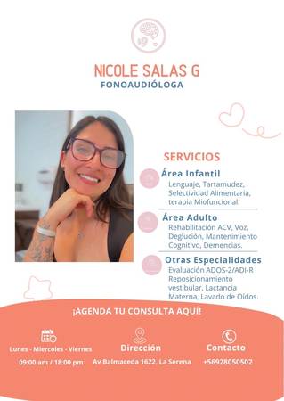 ¡Hola! Soy Nicole, fonoaudióloga apasionada por mi trabajo y comprometida con el bienestar de cada persona que atiendo. Me especializo constantemente en áreas como el neurodesarrollo infantil y juvenil, donde aplico herramientas de evaluación validadas internacionalmente como la ADOS-2 y la entrevista ADI-R para un diagnóstico preciso. Además, brindo atención especializada a adultos y adultos mayores, cubriendo el tratamiento de la voz, la deglución y la tartamudez. Mi enfoque es integral, profesional y empático para acompañar a mis pacientes en su proceso de mejora. Más allá de mis conocimientos técnicos, mi prioridad es brindarte un espacio de confianza y cercanía. Soy una profesional empática y amable, que se dedica a escuchar y comprender tus necesidades para adaptar cada terapia de manera personalizada. Mi objetivo es que te sientas apoyado en cada etapa del proceso, tanto usted como su familia, ya que juntos lograremos los mejores resultados.