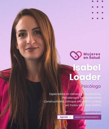 ¡Hola! Mi nombre es Isabel Loader, soy Psicóloga Feminista y Terapeuta Sexual parte del equipo de Mujeres en Salud. (Reembolso con todas las isapres!) Estudié Psicología en la Universidad de Chile, estoy Diplomada en Clínica Cognitivo Constructivista en la misma universidad y Diplomada de Terapia Sexual y de Pareja en la Universitat de Barcelona. Trabajo desde la perspectiva de género e interseccional🏳️🌈💜. Tengo estudios en Disfunciones Sexuales Femeninas, Terapia Breve de Duelo, Terapia Breve, Trauma Sexual y Terapia para la Ansiedad en ADIPA, además de otros cursos y especializaciones constantes. Mi enfoque va dirigido a ayudar a mujeres y disidencias a trabajar temáticas cómo: -Autoestima -Violencia de género -Duelo -Ab0rt0 -Ansiedad -Sexualidad -Depresión -Rupturas de pareja Puedes seguirme en instagram en @psicoafrodita
