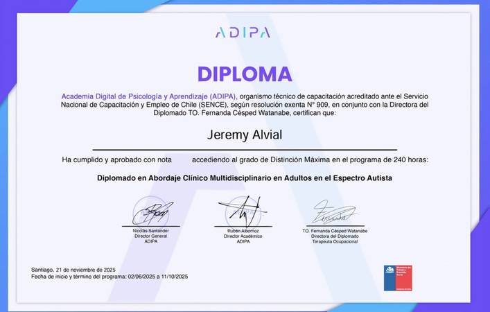 ¡Hola! Mi nombre es Jeremy. Ofrezco atención psicológica exclusivamente a personas mayores de 18 años. Trabajo principalmente desde el modelo sistémico, en particular desde sus perspectivas más contemporáneas como la terapia sistémica breve. Este enfoque busca reducir o eliminar aquellos síntomas que nos resultan invalidantes en el día a día, invitándote a posicionarte desde una nueva forma de percibir y vivir tu realidad. Si bien la teoría es una base importante, para mí lo más relevante es adaptarme a tus necesidades, fomentando un vínculo de confianza y comodidad en cada sesión. Actualmente, cuento con un Diplomado en abordaje clínico multidisciplinario en adultos en el espectro autista, y he realizado diversos cursos de actualización en el área clínica. ¿Con qué problemáticas trabajo? Mi enfoque está orientado principalmente a: - Personas neurodivergentes, especialmente adultos autistas. Busco generar espacios de flexibilidad, comprensión, autoconocimiento y herramientas prácticas para el día a día. (Nota: no realizo evaluación diagnóstica con ADOS-2. Pero si podemos comenzar una sospecha evaluativa y orientativa). Problemas de ansiedad, tales como: - Trastorno de ansiedad generalizada. - Ansiedad social (fobia social). - Agorafobia. - Ataques de pánico / Trastorno del pánico - Otras fobias o temores específicos. Como también problemas con autoestima/autoconcepto. ¿Con qué problemáticas no trabajo? No abordo casos relacionados con: - Consumo problemático de sustancias (adicciones) - Primeros auxilios psicológicos - Trastornos psicóticos (como la esquizofrenia) - Trastornos disociativos - Trastorno bipolar - Intentos suicidas activos - Trastornos neurocognitivos (como demencia) Si bien tengo experiencia en diversas temáticas, creo firmemente en trabajar caso a caso, entendiendo cada diagnóstico como una problemática concreta que puede abordarse desde la experiencia cotidiana. Además, administro el Instagram @mugiwara_no_psico, donde combino dos mundos que me apasionan: One Piece (si no lo has visto, ¡te lo recomiendo!) y la psicología. A través de ese espacio, busco generar contenidos de humor, psicoeducación accesible y cercana. ¡Espero que te animes a mirar la información y cuidar tu salud mental conmigo!