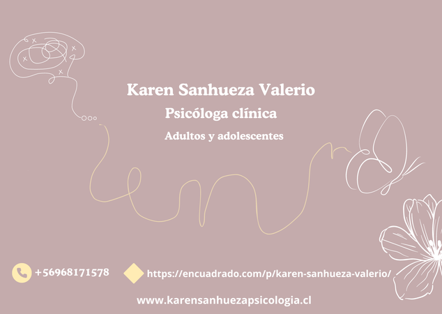 Soy psicóloga de la Universidad de Valparaíso, con formación en psicoterapia Gestalt, Trauma, Terapia centrada en la compasión (CFT), Diplomado en Método de integración cognitivo corporal (MICC), Psicodrama y teatro, soy Actriz egresada de Duoc UC. Soy una terapeuta muy curiosa, me encanta aprender, por eso continuamente estoy formándome en áreas que sean de mi interés y que pueda aplicar en la consulta. También me encanta el teatro, la danza y las diversas prácticas corporales. El enfoque desde el que oriento la terapia es humanista existencial, con una mirada fenomenológica de la realidad, comprendiendo qué y cómo es lo que nos ocurre en el momento presente. En Terapia identificamos y validamos lo que estamos sintiendo y viviendo, trabajamos en torno a la aceptación de quien somos, es decir, intentamos ver y valorar lo que hay, incluso aquello que peleo o rechazo de mí. Si te interesa iniciar un proceso terapéutico, respetuoso, compasivo y amable, este puede ser tu lugar. Trabajo con adolescentes desde los 16 años y adultos(as). POR FAVOR ANTES DE AGENDAR, COMUNICATE A MI WHATSAPP PARA CORROBORAR DISPONIBILIDAD DE HORARIO, DE LO CONTRARIO PODRÍAS OCUPAR EL HORARIO DE OTRO(A) PACIENTE. *ES RESPONSABILIDAD DEL PACIENTE ESCRIBIR CORRECTAMENTE LOS DATOS DE AGENDAMIENTO, YA QUE CON ESTOS SE EMITE AUTOMATICAMENTE LA BOLETA. *SI NO PUEDES ASISTIR A TU SESIÓN DE TERAPIA, PODEMOS REAGENDAR HASTA LA SEMANA SIGUIENTE. SI NUEVAMENTE NO ASISTES, TU HORA QUEDA COMO REALIZADA.