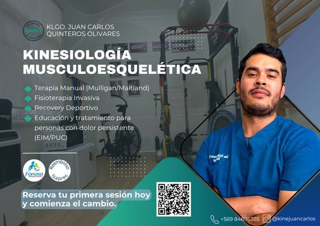 ¡Hola! Soy Juan Carlos, kinesiólogo con más de 14 años de experiencia en el área músculo-esquelética. Mi misión es ayudarte a aliviar y tratar el dolor, ya sea agudo o persistente, relacionado con traumatismos, cirugías o molestias de aparición repentina. Ofrezco una atención personalizada, uno a uno, con un enfoque integral centrado en ti como persona. Mi objetivo es guiarte hacia la recuperación de tu funcionalidad, y acompañarte en el proceso de mejorar tu calidad de vida. Juntos avanzaremos en tu progreso físico y emocional, fortaleciendo tu salud, bienestar y confianza en cada etapa. Te invito a comenzar este camino hacia tu recuperación. FORMACIÓN PROFESIONAL Título Profesional: Kinesiólogo - Universidad Santo Tomás Especialización Académica: • Diplomado en Kinesiología Músculo-esquelética - Universidad de Antofagasta • Diplomado en Kinesiología del Deporte - Universidad Mayor • Concepto de Terapia Manual Maitland Nivel 1 - IMTA Certificaciones Especializadas: • Educación en Neurociencias del Dolor - Evidence in Motion • Exercise is Medicine - Clínica MEDS • Abordaje Kinesiológico en Dolor Persistente - PUC • Rehabilitación de Lesiones de Hombro - Universidad de los Andes • Punción Seca Metamérica • Kinetic Control Cuello y Hombro • Concepto Mulligan • Soporte Vital Básico Kinesiólogo especializado en rehabilitación músculo-esquelética y medicina deportiva. Formación continua en neurociencias del dolor, terapia manual y técnicas de rehabilitación avanzadas.