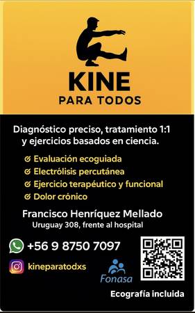 👋 Hola, soy Francisco Henríquez Mellado Kinesiólogo | Titulado en Valparaíso 🧠 Profesional desde 2013 Trabajo con un enfoque funcional y basado en evidencia. Utilizo la ecografía músculo-esquelética como herramienta clave para que puedas ver objetivamente tus lesiones, entender tu dolor y medir tus avances en el tiempo 📊🦾 Mi objetivo no es solo tratar el síntoma, sino ayudarte a moverte mejor, con confianza y sin miedo, integrando: ✔️ Evaluación ecoguiada ✔️ Ejercicio terapéutico y funcional ✔️ Educación en movimiento ✔️ Progresiones claras y seguras PORQUE MOVIMIENTO ES MEDICINA Y cuando entiendes tu cuerpo, los resultados llegan. 📍 Atención 1 a 1 🩺 Fonasa y particular KINESIOTERAPIA RESPIRATORIA ADULTO Y NIÑOS