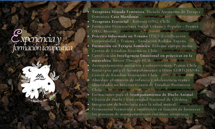 Soy Ligia, psicóloga con más de 8 años de experiencia profesional, de enfoque sistémico con especialización en el acompañamiento a mujeres e identidades disidentes. Mi trabajo se sostiene desde una mirada situada, crítica, no patologizante y respetuosa, que reconoce los contextos sociales, políticos y ecológicos que atraviesan nuestros malestares. Mi enfoque terapéutico busca reconectar la conciencia de quiénes somos con la naturaleza que somos, donde los ciclos y sus propios tiempos nos orientan a comprender la vida psíquica como un proceso vivo, relacional y en constante transformación. Este espacio terapéutico es una propuesta de apoyo, exploración y autoconocimiento, una invitación a detenernos y mirar con cuidado aquello que inquieta, duele o tensiona. Desde una vereda reflexiva y situada a nuestros contextos, abrimos la posibilidad de revisar, transformar e integrar nuevas formas de habitar el entorno, los vínculos y a nosotrxs mismxs, cultivando caminos más compasivos, conscientes y saludables. ¿Qué hacemos en terapia? La terapia es un espacio de escucha y diálogo co-construido, horizontal y respetuoso de los tiempos y ritmos de cada persona. Utilizaremos diversas herramientas —como arteterapia, prácticas narrativas y psicocorporalidad— y dialogaremos con distintos enfoques, entre ellos la psicología crítica, los feminismos, el enfoque ecosocial, la ética antiespecista y conciencia con nuestros entornos. El objetivo es identificar, nombrar, explorar, comprender y reescribir aquello que definamos como foco terapéutico, generando estrategias y nuevas comprensiones que den voz, sentido y lugar al malestar. Por tu parte, el proceso requiere compromiso, apertura y responsabilidad con tu propio camino. Este es un espacio seguro y afín para todas las existencias en resistencia hacia los modelos de explotación de los cuerpos, los territorios y la vida. Puedes conocer más de mi trabajo en Instagram @adentrounjardin o escribirme a ps.ligiagallardo@gmail.com Te acompaño a conocer y cuidar tu propio jardín 🌱