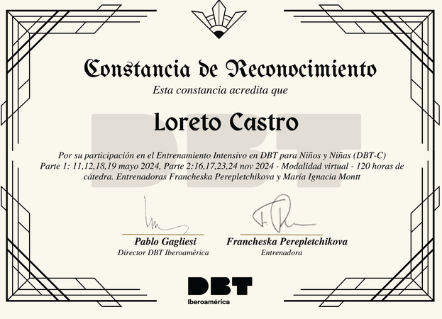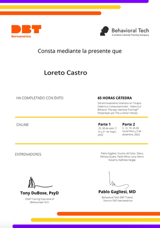 Psicólogo, Universidad de Chile Acreditada como Psicóloga Clínica - Máster en Psicología Evolutiva Mención Terapia Familiar, Universidad Santiago de Compostela. - Postítulo en Terapia Familiar y de Pareja Instituto Chileno de Terapia Familiar ICHTF - Diplomado en Psicología Positiva - Especialización en Supervisión Clínica, Instituto Chileno de Terapia Familiar, ICHTF - Especialización en Terapia DBT, Terapia Dialéctica Conductual - Especialización en Terapia DBT Niños, DBT - C Consulta Presencial y TeleMedicina Pedir hora a través de Whatsapp +56 9 99697485