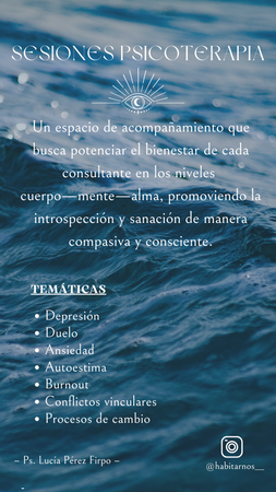 Hola a todos/as! Soy Lucía Pérez Firpo, psicóloga clínica. Egresada de la Universidad del Desarrollo, con diplomado en Mindfulness y certificación en procesos de duelo en la misma casa de estudios. Trabajo con adolescentes y adultos que buscan potenciar su bienestar emocional, sanar y reconectarse consigo mismas. Hago un acompañamiento psicológico desde un enfoque integrativo, considerando diferentes miradas teóricas que me permiten entender lo que está pasando en su totalidad, y así realizar una terapia personalizada en base a las necesidades de cada consultante. Como todo ser humano, sigo en constante aprendizaje, y la introspección y cuestionamiento del mundo son parte de mí. Habitarme, es parte de mí. Creo que nuestro día a día implica habitar(nos), tanto en la “luz”, como en la “oscuridad”. Habitar(nos) permitiéndonos incorporar todos los estados propios de nuestra existencia, con autocompasión y respetando nuestros tiempos. Feliz de poder acompañarte en este camino de “habitarte” brindándote un espacio seguro, de escucha activa y confianza. ¡Te espero! ~ Lucía