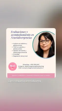www.psicologamariaelenaduarte.cl Mi profesión es Psicóloga Clínica, Licenciada en psicología de la Universidad de Santiago de Chile. Me especializo en Psicología Clínica, con experiencia en gestión de las emociones, ansiedad, estrés, depresión. Tengo 27 años de experiencia en el trabajo con niñ@s, adolescentes y adultos. Actualmente me encuentro especializada en acompañamiento y evaluación a adolescentes y adultos autistas. - Certificada por la Universidad de California (USA) en Peers, Programa dirigido al desarrollo de habilidades sociales en personas neurodivergentes. - Certificada en Evaluación Ados 2 - Certificada en Autismo Femenino - Certificada en Acompañamiento a Neurodivergencias. - Máster en Psicoterapias del bienestar emocional. - Postítulo en integración pedagógica y social. - Curso Evaluación y acompañamiento a personas autistas adultas. - Curso Procesamiento Sensorial - Curso autismo a lo largo del ciclo vital. Si tienes alguna duda, puedes escribirme al WHATSAPP +56931852401 (aunque aparezca aquí que no hay horas disponibles, tenemos horas a su disposición.) ATENCIÓN A MAYORES DE 10 AÑOS
