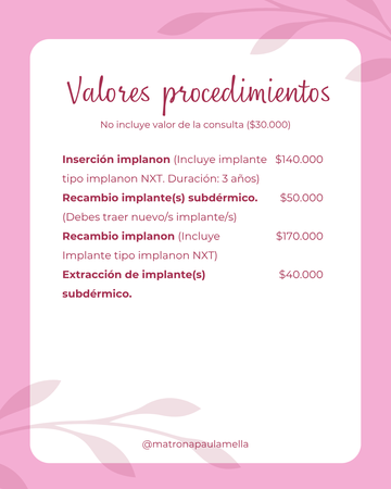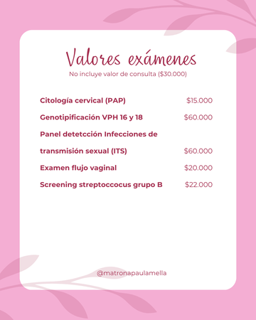 Mi nombre es Paula Mella, soy Matrona, Educadora en métodos de fertilidad natural y especialista en salud menstrual. 📖Autora de "El placer de conocernos" y " El lado invisible de ser mujer" En este espacio busco transformar por completo la experiencia de la consulta ginecológica. Creo un entorno respetuoso, empático y cálido, donde puedas sentirte segura, escuchada y acompañada. Atiendo desde un enfoque integrativo y funcional, abordando la salud menstrual, la anticoncepción natural y hormonal, el control preconcepcional, la perimenopausia y más. Conmigo puedes evaluar tu salud del ciclo, consultar en tu búsqueda de embarazo, o atenderte para inserciones y extracciones de implantes subdérmicos o dispositivos intrauterinos. También realizo toma de PAP, PCR para VPH y estudios complementarios. 💗 Mi misión es que nunca más sientas miedo o incomodidad en una consulta ginecológica, sino que la vivas como una experiencia amorosa, informada y transformadora. ⚠️ INFORMACIÓN IMPORTANTE ⚠️ Al seleccionar cada atención podrás encontrar más detalles de cada una de ellas. ("VER MÁS DETALLES") El precio de los servicios en plataforma, ya tienen el valor de la consulta ($30.000) agregado. Sin embargo, si tomas consulta general y deseas posteriormente agregar algún procedimiento o examen, el valor de estos se cancelará aparte. Puedes revisar las imágenes con el valor de cada uno. La consuta es particular, pero puedes reembolsar en ISAPRES (según cada plan) y seguros complementarios, presentando tu boleta de atención. En caso de agendar consulta + algun procedimiento o examen y estos últimos no se puedan realizar, se cobrará solo el valor de consulta ($30.000). Para tener información sobre mis programas y cursos de anticoncepción natural, método sintotérmico o búsqueda de embarazo, ingresa a www.matronapaulamella.com Te espero.❤️