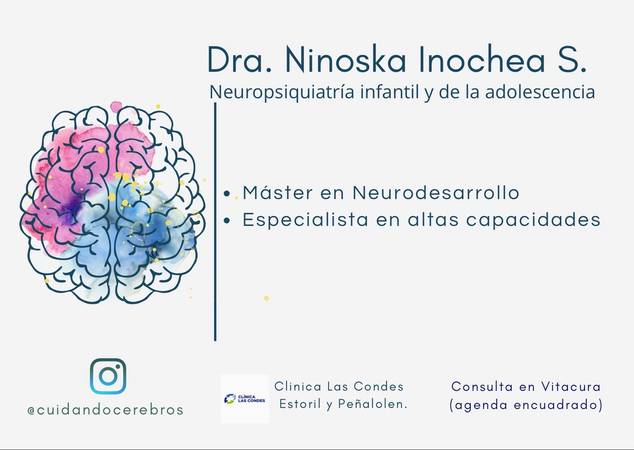 - Soy médica cirujana de la Universidad del Valle, con 3 años de formación en la especialidad de Neurología infantil Universidad de Chile/Universidad de Valparaíso. - Diplomada en Pediatría por la Universidad de los Andes. - Diplomada en Pedagogía en ciencias de la salud por la Universidad Finis Terrae. - Máster en Neurodesarrollo y Neuropediatría en España. - Postítulo en Psicopatología infanto-juvenil por la Universidad de Chile. - Psiquiatra infantil y de la adolescencia por la Universidad de Santiago de Chile. - Tengo amplia formación y mas de 15 años de experiencia en el área infanto-juvenil. - Además cuento con formación universitaria en Altas capacidades y desarrollo de talento por la Universidad de La Rioja - España y certificación internacional para evaluación y acompañamiento en AACC, haciendo foco en la doble excepcionalidad que es mi área de investigación clínica. - En la consulta atiendo pacientes desde los 5 años hasta los 18- 19 años. *TERMINOS Y CONDICIONES DEL SERVICIO: - La atención dura 45 minutos - Si consultas por primera vez, el ingreso se realiza idealmente en 3 sesiones. No es necesario agendar las 3 horas en una sola vez. La planificación de las sesiones consiste en: 1ª sesión con los padres, 2ª sesión con el/la paciente y 3ª sesión para devolución y plan de intervención. La razón por la cual se necesita mas de una sesión para el ingreso, es porque los pacientes que consultan por problemas de salud mental se requiere información de distintas fuentes ( historia personal y familiar, antecedentes del desarrollo, información por terceros u otros profesionales tratantes, reportes del colegio, etc.). - Mantener un espacio apto para la evaluación. -Se solicita puntualidad, para poder adecuarnos a los tiempos de atención. - Si eres el paciente y tienes mas de 18 años, la primera sesión será solo contigo y si estas de acuerdo entrevistaré a tus padres o cuidadores.