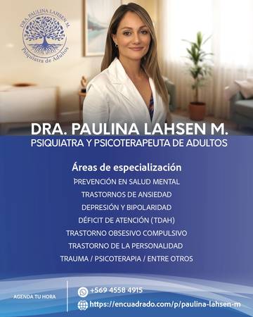 ATENCIONES ONLINE Y PRESENCIAL (> 16 años) Psiquiatra de Adultos, Universidad de Santiago de Chile. Médica Cirujana, Universidad de Los Andes, Chile. Diplomada en Trastornos de la Personalidad, Universidad de Valparaíso. Postítulos en Psicoterapia Aplicada: Terapeuta en Eye Movement Desensitization and Reprocessing (EMDR Europe) y Transference-focused psychotherapy (ISTFP). Diplomada en Medicina Interna, Universidad de Chile. Registro Superintendencia de Salud: 106204 ÁREAS DE ESPECIALIZACIÓN: Trastornos de ansiedad, pánico, fobias. Trastornos del ánimo (depresión y bipolaridad) Trastorno por deficit de atención e hiperactividad del adulto (TDAH) Trastorno de estrés post traumático (TEPT) Trastorno obsesivo-compulsivo (TOC) Insomnio Duelo Trastorno del Espectro Autista en adultos (Grado 1-2) Trastornos de la adaptación Cuidado emocional en tratamientos de fertilidad Cese del tabaquismo Trastornos de la personalidad (leves y moderados) Medicina psicosomática. Psicoterapia Prevención en salud mental email: doctora.saludmental@gmail.com whatsApp consulta: +56945584915 - Puede re-agendar la cita hasta 48hrs antes, usted mismo en el link del email de confirmación. - No se realizan certificados para porte de armas. - No se emiten licencias para Dipreca ni Capredena.
