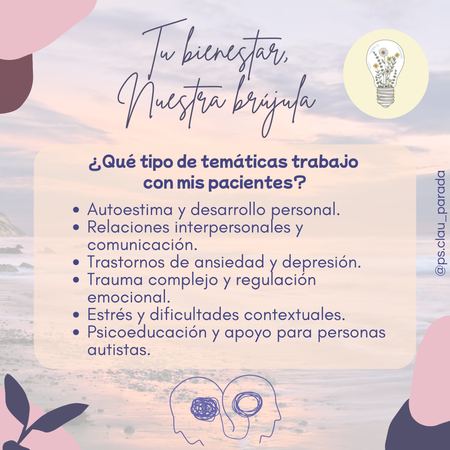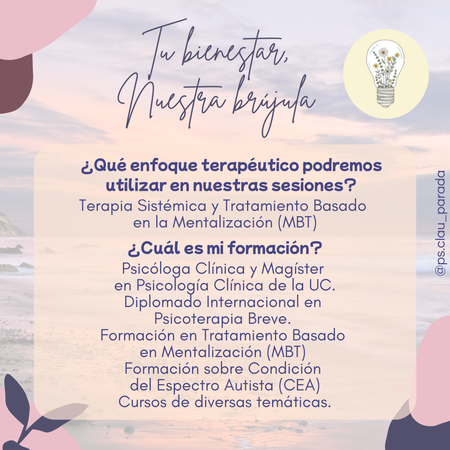 Bienvenidos a mi perfil! Soy Claudia Parada González, psicóloga clínica y terapeuta con más de 4 años de experiencia en acompañar a personas hacia su bienestar emocional. Mi enfoque es Sistémico Integrativo, lo que significa que considero todos los aspectos de tu vida para lograr cambios sostenibles. Trabajo también con Terapia Basada en Mentalización (MBT), una herramienta eficaz para ayudarte a comprender tus pensamientos y emociones. Soy titulada en Psicología y tengo un Magíster en Psicología Clínica de la UC, así como un Diplomado Internacional en Psicoterapia Breve. Además, me he formado en Tratamiento Basada en Mentalización (MBT) y en Condición del Espectro Autista (CEA), para ofrecerte una atención especializada y actualizada. Trabajo con mis pacientes en temas como: - Autoestima y desarrollo personal - Relaciones interpersonales y comunicación - Trastornos de ansiedad y depresión - Trauma complejo y regulación emocional - Estrés, duelo y crisis vitales - Psicoeducación y apoyo para personas autistas Mis sesiones están disponibles tanto en modalidad online como presencial (en Macul), adaptándome a tus necesidades y horarios. ¿Por qué elegir trabajar conmigo? Te ofrezco un espacio de confianza y respeto, en donde te sentirás acompañado/a durante todo el proceso terapéutico. Además, en mi consulta considero un número limitado de cupos con valor diferencial para quienes lo necesiten (puedes consultar). No trabajo con personas que enfrentan adicciones ni trastornos de conducta alimentaria, pero estaré feliz de ayudarte en otros aspectos relacionados con la salud mental. Si sientes que puedo ayudarte, te invito a dar el primer paso. Estoy aquí para escucharte y acompañarte en tu camino hacia una vida más plena. @ps.clau_parada