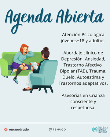 ¡Hola! Soy Daniela, Psicóloga Clínica especializada en psicoterapia para adultos desde un enfoque sistémico integrativo. Trabajo de manera online y presencial en Temuco 🫂.Para agendar en la oficina puedes contactarme al Whatsapp que está mas abajito o sacar hora directo en el Centro Médico 📲+569 3285 6407 🦋 Te invito a iniciar un camino transformador para que encuentres el bienestar que tanto anhelas en un espacio amoroso, seguro y libre de juicios. ❤️🩹 ¡Feliz y honrada de acompañarte en cada paso! 🌟 Puedes seguirme en Instagram como: @ps.danielaespinosa