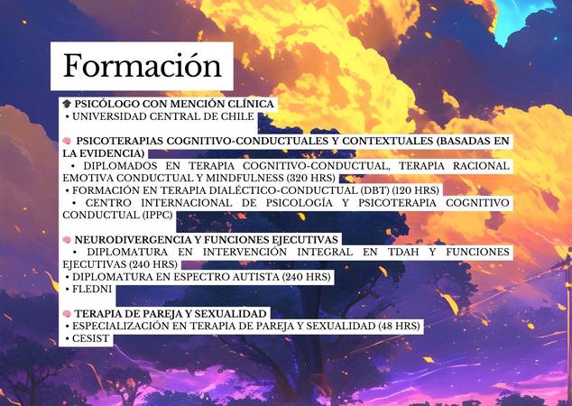 📚 𝐅𝐨𝐫𝐦𝐚𝐜𝐢𝐨𝐧 𝐏𝐫𝐨𝐟𝐞𝐬𝐢𝐨𝐧𝐚𝐥: 🎓 Psicólogo con mención clínica- Universidad Central de Chile 🧠Diplomados en Terapia Cognitivo-Conductual, Terapia Racional Emotiva y Mindfulness (320 hrs)- Centro Internacional de Psicología y Psicoterapia Cognitiva Comportamental (IPPC) 🧠 Diplomatura en Intervención Integral en TDAH y Funciones Ejecutivas (240 hrs)- FLEDNI 🧠 Diplomatura en Espectro Autista (240 hrs)- FLEDNI 🧠 Especialización en Terapia de Pareja y Sexualidad (48 hrs) - CESIST 𝐂𝐮𝐫𝐬𝐨𝐬 𝐲 𝐞𝐬𝐩𝐞𝐜𝐢𝐚𝐥𝐢𝐳𝐚𝐜𝐢𝐨𝐧𝐞𝐬 𝐞𝐬𝐩𝐞𝐜𝐢𝐟𝐢𝐜𝐚𝐬: He complementado mi formación con diversos cursos de especialización, entre ellos: Trastornos Depresivos y Bipolares: Causas y Abordaje en el Contexto Actual (12 horas), Abordaje Clínico de la Regulación Emocional en Adultos desde la Terapia Dialéctica Conductual (8 horas), Trastornos de Personalidad: Diagnóstico y Abordajes Terapéuticos Basados en la Evidencia (8 horas), Riesgo Suicida en la Adolescencia y la Adultez Emergente: Abordaje e Intervención en el Ejercicio Clínico (8 horas), Trastorno Obsesivo Compulsivo: Diagnóstico y Tratamiento Integral en Adultos (8 horas), Terapia Breve del Duelo (8 horas) y Psicofarmacología para Psicólogos: Bases y Acompañamiento Psicoterapéutico (8 horas). 𝐌𝐨𝐝𝐞𝐥𝐨 𝐭𝐞𝐫𝐚𝐩𝐞𝐮𝐭𝐢𝐜𝐨 𝐲 𝐦𝐢 𝐟𝐨𝐫𝐦𝐚 𝐝𝐞 𝐭𝐫𝐚𝐛𝐚𝐣𝐨: Mi enfoque de trabajo se fundamenta principalmente en la Terapia Cognitivo-Conductual (TCC), un modelo basado en la evidencia que permite identificar y modificar pensamientos, emociones y conductas que generan malestar, favoreciendo el desarrollo de estrategias prácticas para mejorar la calidad de vida. Complemento este abordaje con herramientas provenientes de la Terapia Dialéctico Conductual (DBT), especialmente útiles en la regulación emocional, la tolerancia al malestar y el fortalecimiento de habilidades interpersonales. Asimismo, integro principios de la Terapia de Aceptación y Compromiso (ACT), que promueve la flexibilidad psicológica, el contacto con los valores personales y la construcción de una vida más significativa. Mi forma de trabajo se centra en el proceso colaborativo, adaptando las intervenciones a las necesidades de cada consultante, con un estilo cercano, estructurado y orientado a objetivos concretos. 𝐓𝐞𝐦𝐚𝐭𝐢𝐜𝐚𝐬 𝐪𝐮𝐞 𝐧𝐨 𝐭𝐫𝐚𝐛𝐚𝐣𝐨: (𝐈𝐌𝐏𝐎𝐑𝐓𝐀𝐍𝐓𝐄) En mi práctica clínica no trabajo con infancias ni adolescencias, tampoco realizo terapia familiar. Además, no atiendo casos relacionados con trauma complejo, trastornos de la conducta alimentaria (TCA), adicciones a sustancias (solo abordo adicciones conductuales leves), situaciones de abuso sexual, trastorno de identidad disociativo, psicosis o esquizofrenia. De igual forma, no tomo casos en contexto de emergencias psiquiátricas, riesgo suicida agudo ni de violencia intrafamiliar severa, ya que requieren un abordaje especializado y multidisciplinario.
