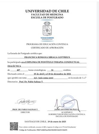 Soy Fran, una Psicóloga Clínica y Psicoterapeuta dedicada a tratar Trastornos de Personalidad. He completado estudios avanzados en Neurociencias y Terapia Dialéctico Conductual, y estoy finalizando un Magíster en Trastornos de Personalidad y TCA en España. Participo activamente en la Comisión de Ética del Colegio de Psicólogos y mi práctica se centra en el enfoque Cognitivo Conductual. Por favor, recuerde notificar cancelaciones con 24 horas de anticipación para evitar cargos. Consulte los términos y condiciones para más información."