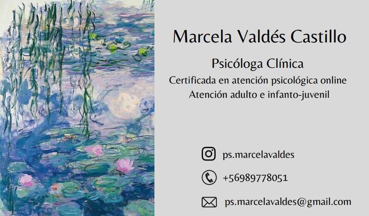 Hola! Mi nombre es Marcela Valdés y soy psicóloga clínica y atiendo adolescentes y adultos. Soy una profesional comprometida con la salud mental de las personas y su desarrollo, competente en el abordaje clínico de diversas patologías asociadas a ansiedad, depresión, autoestima, suicidio y estrés. Estoy capacitada para la atención individual de adolescentes y adultos desde un enfoque sistémico. Destaca formación académica en psicología clínica, parentalidad, apego, enfoque de género, riesgo suicida y abordaje de población LGBTIQ+. Mi registro en la superintendencia de salud es N° 655072. Si tienes dudas puedes escribirme a mi WhatsApp +56986150547 o a mi correo: ps.marcelavaldes@gmail.com