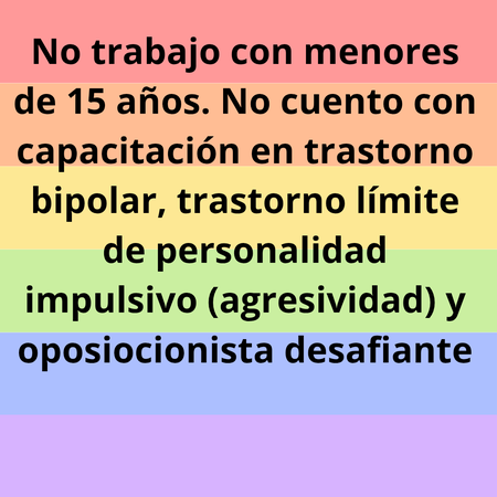 Mi nombre es Romina Riquelme Córdova, egresada de la Universidad Católica de Temuco, cuento con experiencia en trabajo con niños, adolescentes y adultos, en áreas clínica, educacional y comunitaria. Mí principal objetivo es que trabajemos en conjunto para mejorar nuestra salud mental por medio de inclusividad y accesibilidad de la psicología para tod@s. Psicoterapia: Trastornos ansiosos Depresión Trastorno de la conducta alimentaria Terapia inclusiva Estrés Problemas de autoestima Abuso sexual Trauma complejo Angustia Duelos patológicos No trabajo con menores de 15 años. No cuento con capacitación en trastorno bipolar, trastorno límite de personalidad y oposiocionista desafiante Universidad Católica Psicóloga Adelante Educa (Temuco, 2018) Gestión en Programa de Integración Escolar Adelante Educa (Temuco, 2018) Diseño Universal de Aprendizaje Adelante Educa (Temuco, 2018) Detección, Actuación y Prevención de Abuso Sexual Infantil y Líneas de Acción en el Ámbito Escolar Pro Consultores (Temuco, 2018) Diplomado Clínica Infanto Juvenil. Adelante Educa(Temuco, 2019) Evaluación Psicométrica PIE, WISC-V Adelante Educa (Temuco, 2019) Coordinador(a) PIE Crysol (Santiago, 2019) Nivel I. Terapia No verbal, Benenzon de musicoterapia CESIST (Temuco, 2019) Diplomado en Aplicaciones de Terapia Sistémica Breve. Aportes desde Latinoamérica Sociedad Chilena Desarrollo Socioemocional (2020) Apego y Parentalidad. Respuestas científicas a desafíos permanentes Sociedad Chilena Desarrollo Socioemocional (2020) Curso Internacional Teórico-Práctico: Comer por Ansiedad y Estrés ¿Por qué ocurre y cómo enfrentarlo? Taller sistemas de comunicación en trastorno del espectro autista (2021)Ainen formación Intervención en trauma complejo: Estrategias clínicas (2021) ADIPA Simposio manejo integral de personas transgenero (2021) Autoagresiones y conducta suicida en niñas, niños y adolescentes. (2021) ADIPA Diplomado terapia breve para la depresión (2022) CESIST Diplomado en Abordaje Clínico Multidisciplinario en Adultos en el Espectro Autista (2023) ADIPA Atenciones mayor a 15 años, no atiendo Infantil. No trabajo bipolar, trastorno límite personalidad.