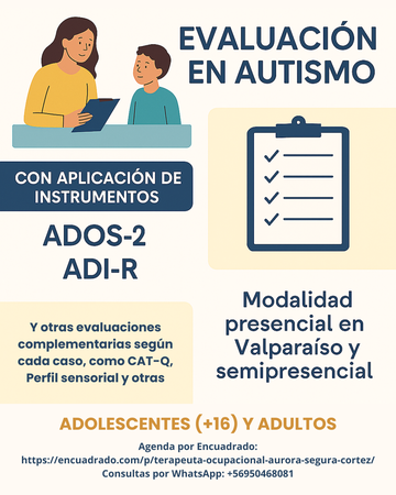¡Hola! Soy Aurora, terapeuta ocupacional especializada en el acompañamiento de personas Autistas, con TDAH (Atención Divergente) y otras neurodivergencias, enfocada en mejorar su desempeño ocupacional. Realizo sesiones online en todo Chile y atención presencial en Valparaíso y Viña del Mar. Contáctame para una consulta personalizada y descubre cómo puedo ayudarte a alcanzar tus metas. Ofrezco: - Evaluación y acompañamiento de terapia ocupacional - Evaluación ADOS-2* y ADI-R para el apoyo diagnóstico de Autismo - Evaluación de perfil sensorial con sugerencias personalizadas *La aplicación del test ADOS-2 debe ser presencial. Si deseas agendar conmigo, abajo encontrarás información sobre los diferentes servicios, valores y packs de sesiones. Gracias por leer. Un abrazo Aurora