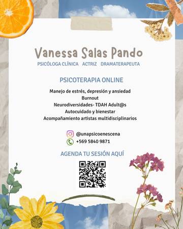 ✨ Holaa, qué bueno que llegaste hasta aquí! Si estás leyendo esto, probablemente estás buscando un espacio seguro para conversar, comprender lo que estás viviendo o comenzar un proceso de acompañamiento terapéutico. Pero antes de seguir, me presento (por si aún no me conoces). Mi nombre es Vanessa, soy psicóloga clínica, con enfoque sistémico y narrativo, y acompaño procesos de psicoterapia individual online para personas adultas. Trabajo con quienes desean comprender su malestar emocional, resignificar su historia personal y habitar su vida de una manera más clara, honesta y equilibrada. Tengo casi 8 años de experiencia en contextos organizacionales y de RRHH, lo que me ha permitido desarrollar una mirada profunda sobre cómo el trabajo, la empleabilidad y las exigencias laborales impactan directamente en nuestra salud mental. Acompaño principalmente a personas sensibles, neuro divergentes, creativas o multipotenciales, que viven ansiedad, desgaste emocional, conflictos identitarios, dificultades relacionales o tensiones entre lo personal y lo laboral. Mi enfoque integra palabra, cuerpo y experiencia como formas legítimas de comprendernos, siempre entendiendo que nada de lo que nos ocurre aparece aislado: todo está en relación con nuestra historia, nuestros vínculos y los contextos que habitamos. 🎭 Mi enfoque de trabajo Psicoterapia sistémica y narrativa Integración de conciencia corporal y experiencia Acompañamiento desde una mirada sensible, ética y no rígida Atención online para personas adultas 📚 Formación académica y profesional Psicóloga, PUCV Formación en Terapia Sistémica Formación en Terapia Narrativa, Pranas Chile Diplomada en Dramaterapia, Universidad de Chile Certificado Nivel I Dramaterapeuta, EDRAS Chile Actriz profesional Formación y experiencia en trabajo corporal, expresivo y creativo aplicado a procesos terapéuticos Diplomada en Pedagogía Teatral, UC 🌱 Mis pilares de acompañamiento terapéutico es: La humanidad compartida La escucha sin juicio El respeto por los tiempos y procesos individuales La integración entre cuerpo, palabra y experiencia 📩 Agenda y contacto Si tienes dudas o necesitas aclarar algo antes de comenzar, puedes escribirme directamente a: WhatsApp: +56 9 5840 9871 Correo: psi.vanessasalaspando@gmail.com Instagram: @unapsicoenescena Nos vemos!!