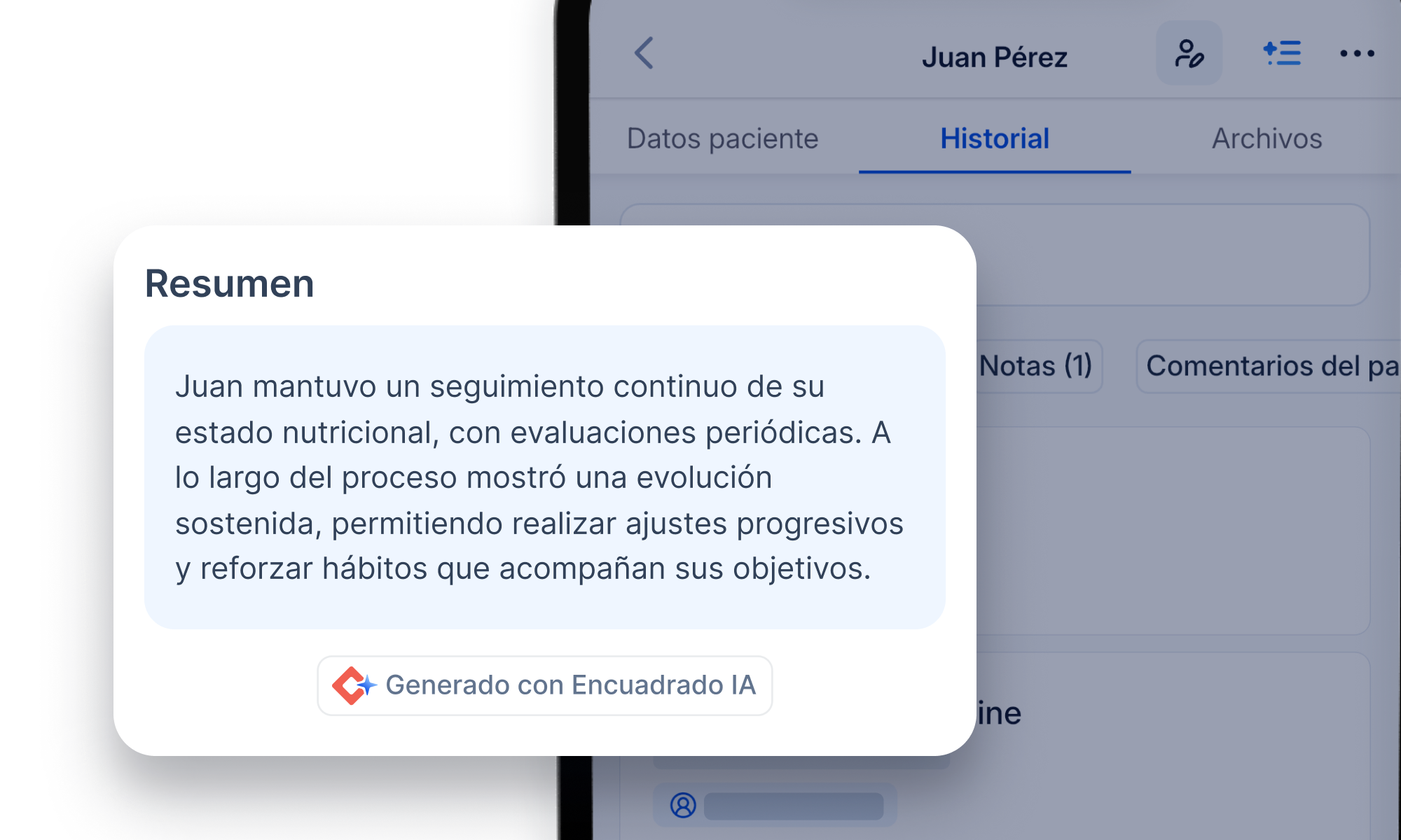 Para resolver esa tensión, ahora puedes abrir la App de Encuadrado y grabar la sesión presencial. Al finalizar, tendrás disponible un resumen y la transcripción completa de la conversación.